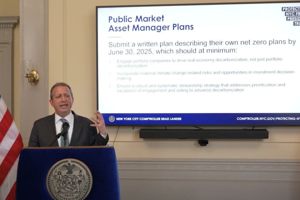 In a letter sent to the NYC pension funds’ asset managers, Lander said that if managers that fail to submit net zero plans or submit plans that fail to meet the standards, the Comptroller’s office will recommend that the pension boards “put the investment strategy out to bid.”